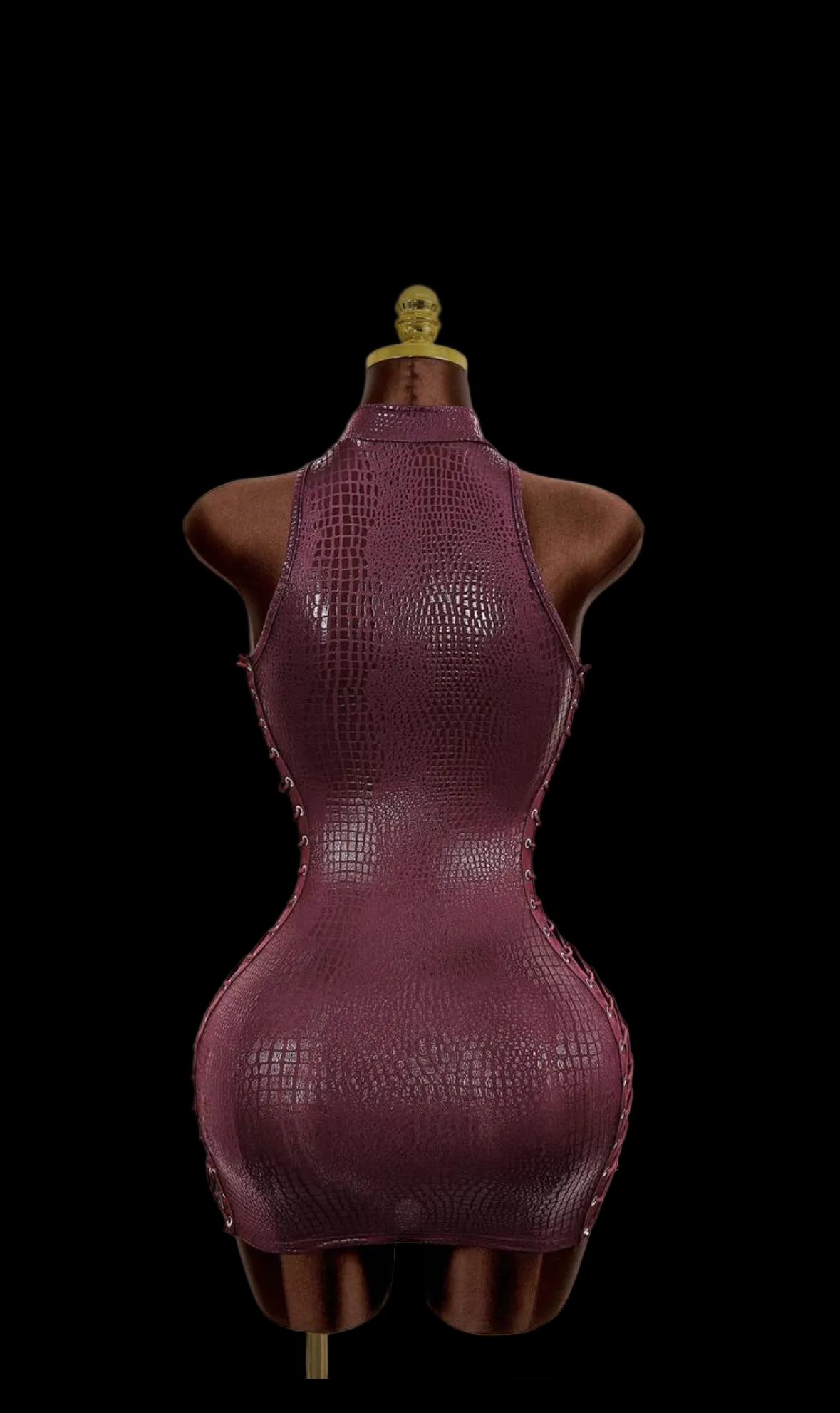 Crafted in a luxe leather-look finish with a high neckline and dramatic lace-up sides, this dress hugs every curve while giving a bold, elevated Silhouette.